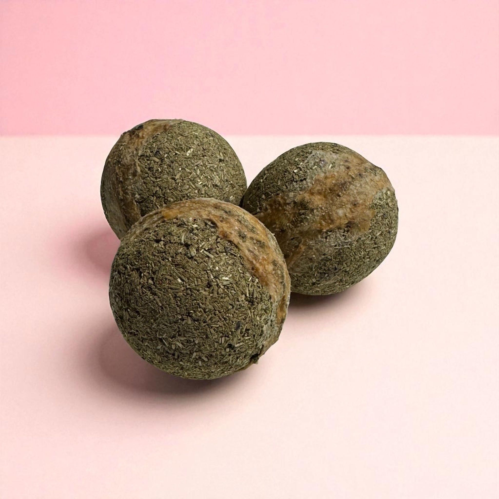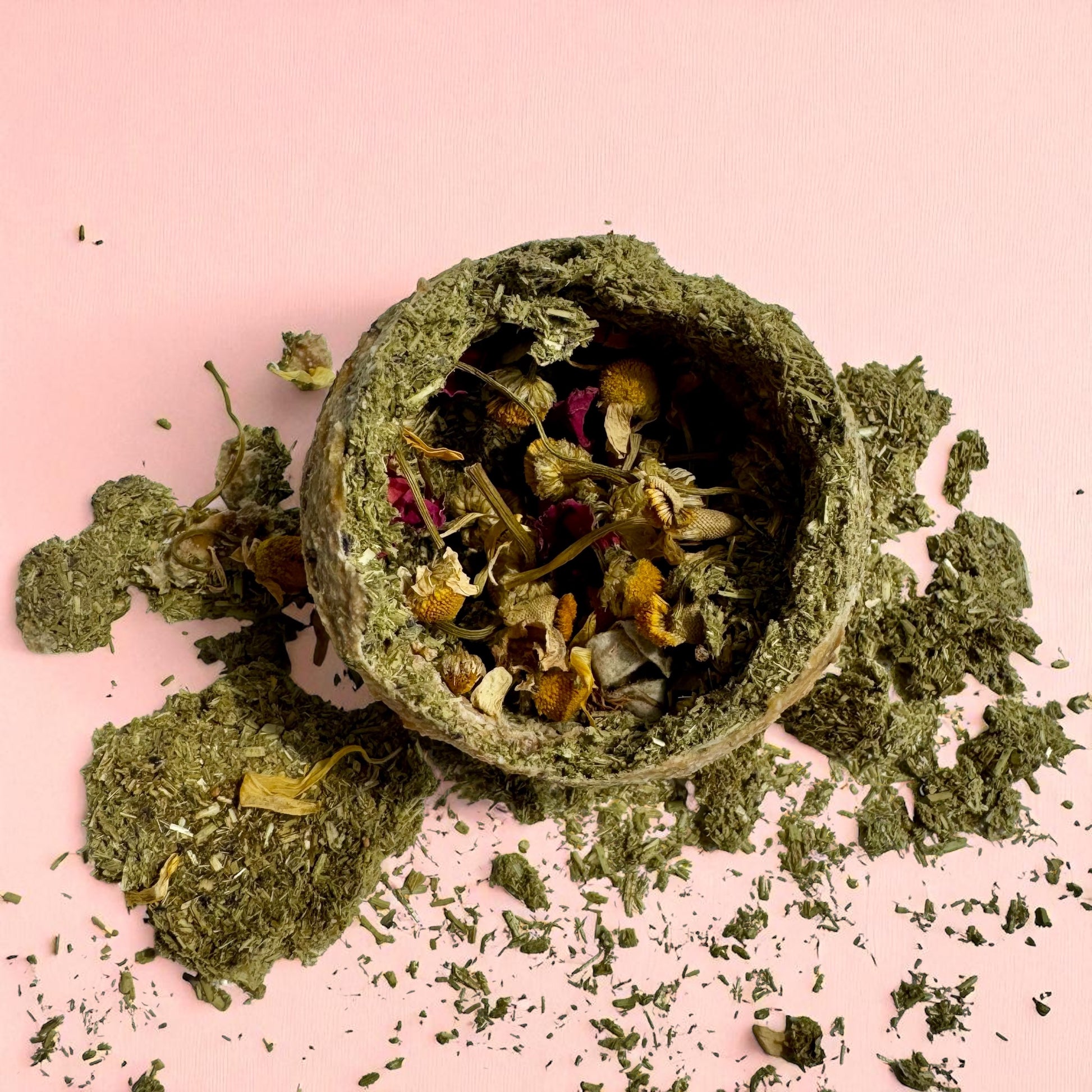 Ingredients: Timothy hay, organic blueberry, organic banana, organic oat flour, organic dried herbs and flowers (chamomile, rose petals, calendula, and echinacea)