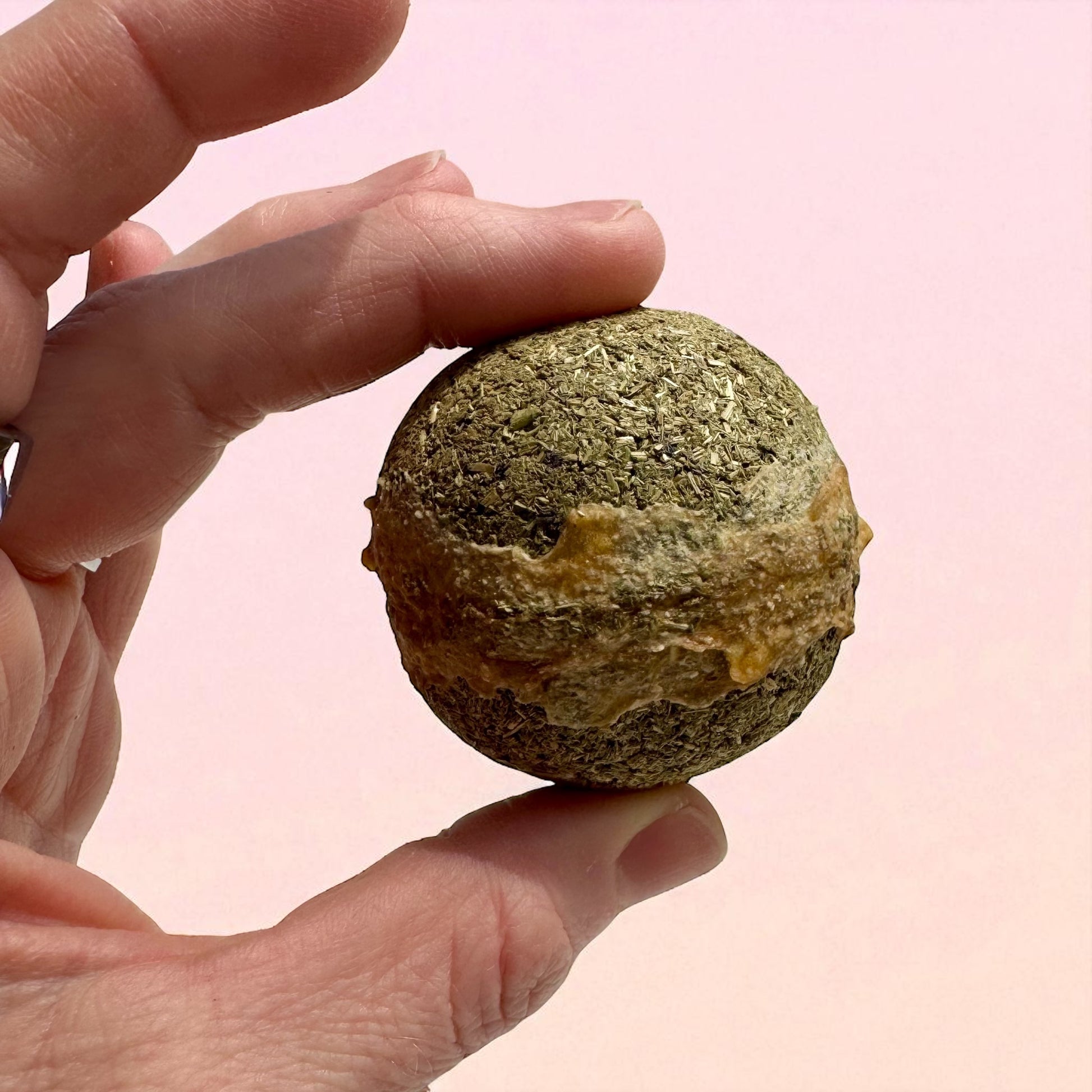Our Blossom Burst Pop is an extra-special post-summer treat for your bun. The shell is made from a blend of timothy hay and organic fruit, which is bound with organic banana and a pinch of oat flour. The inside is filled with a variety of organic dried herbs and flowers. Watch your rabbit chew through the shell to reveal a hidden surprise inside!