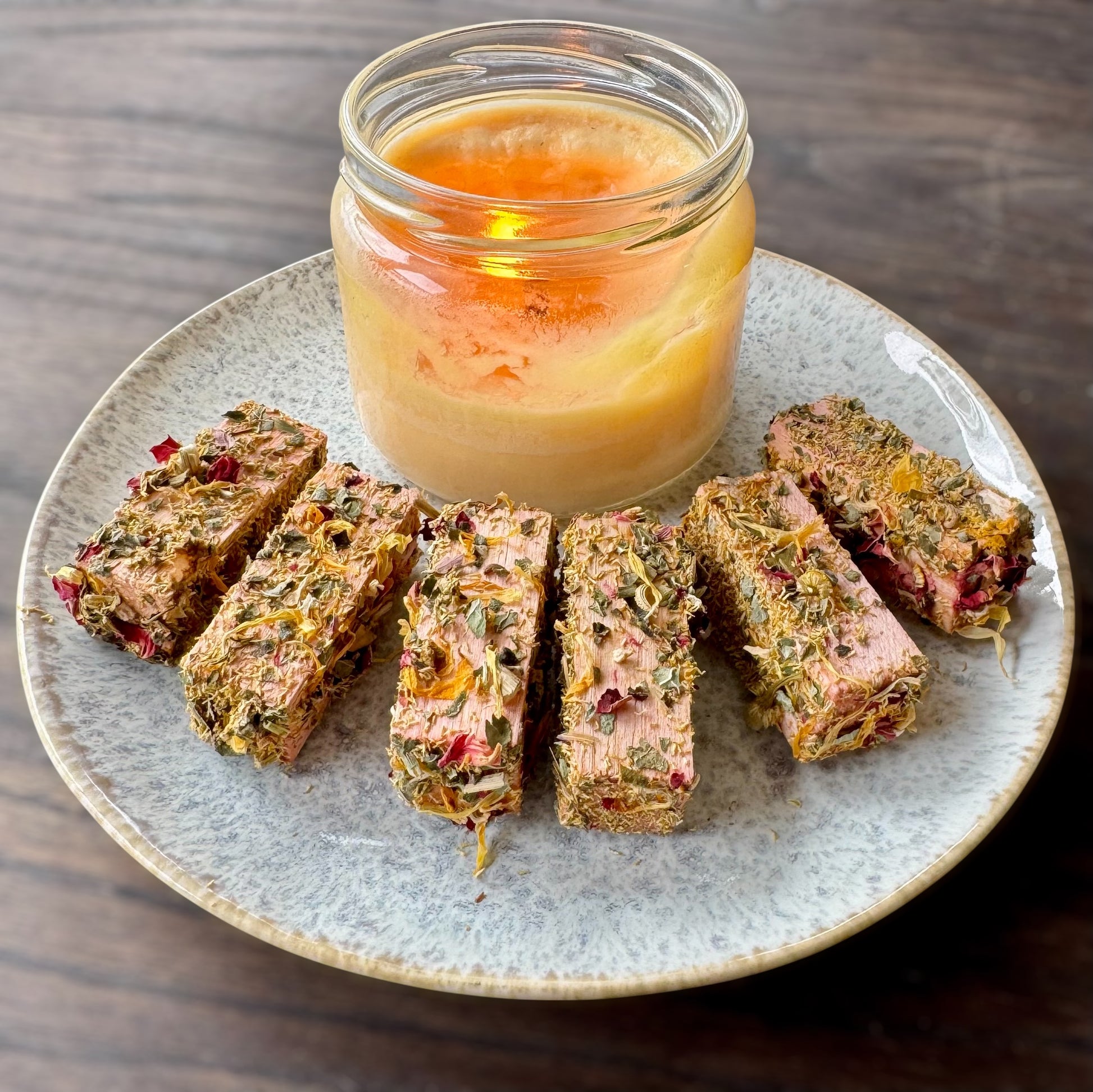 Ingredients: Untreated balsa wood, 100% organic fruit juice and organic fruit puree (strawberry, papaya, banana, blueberry), organic herb blend (rose, calendula, echinacea, hibiscus, chamomile)