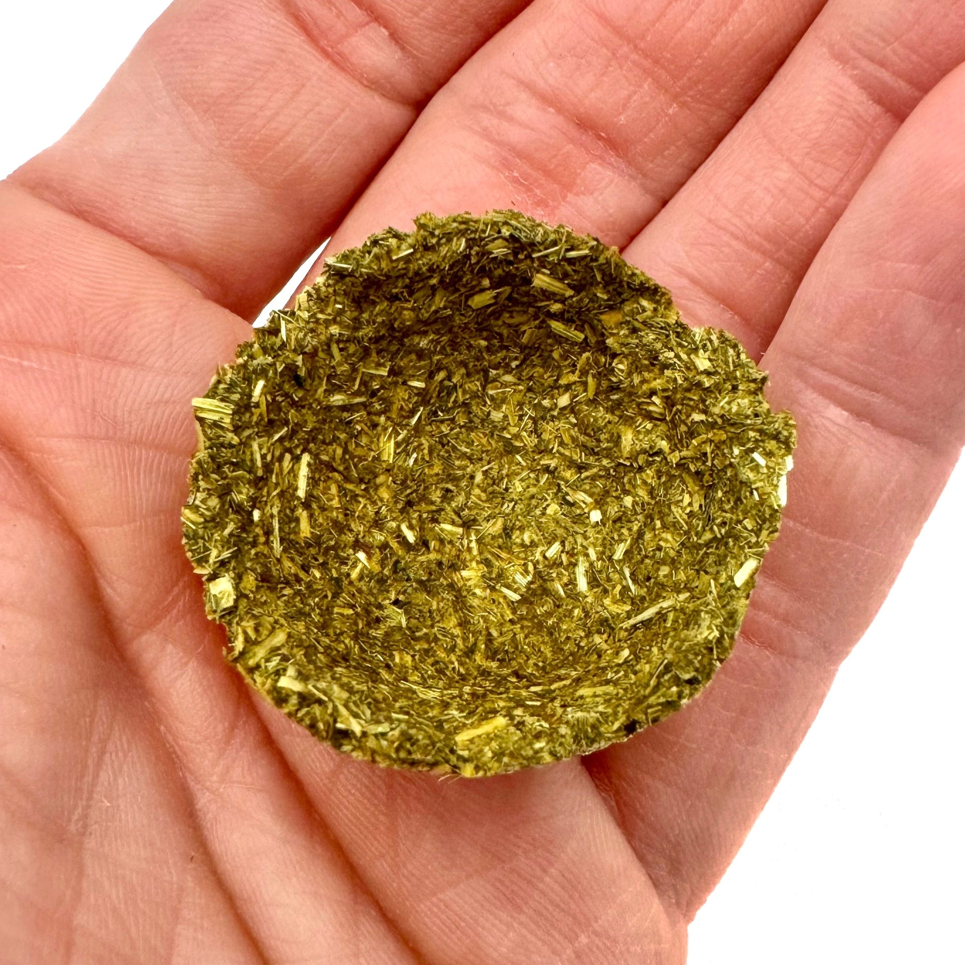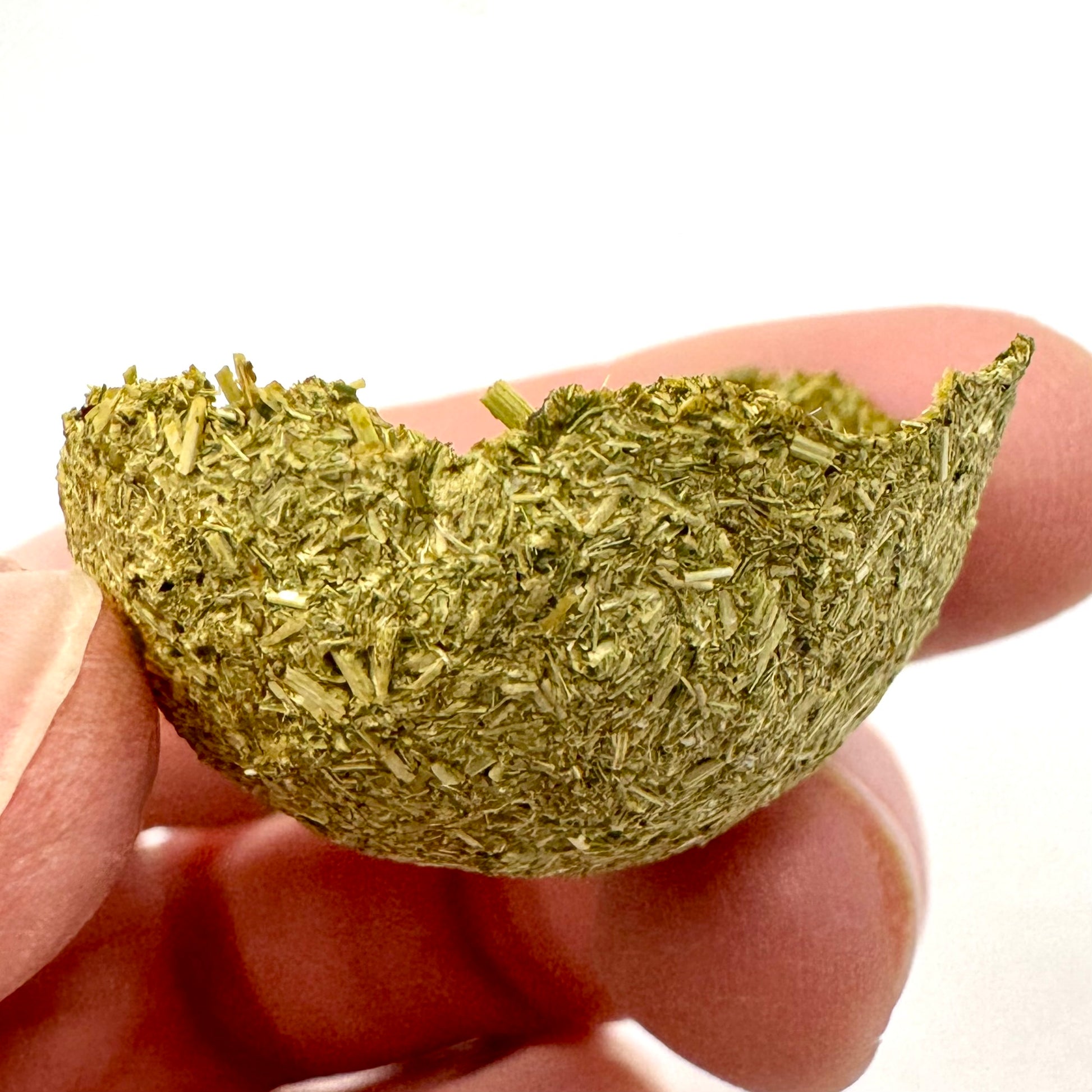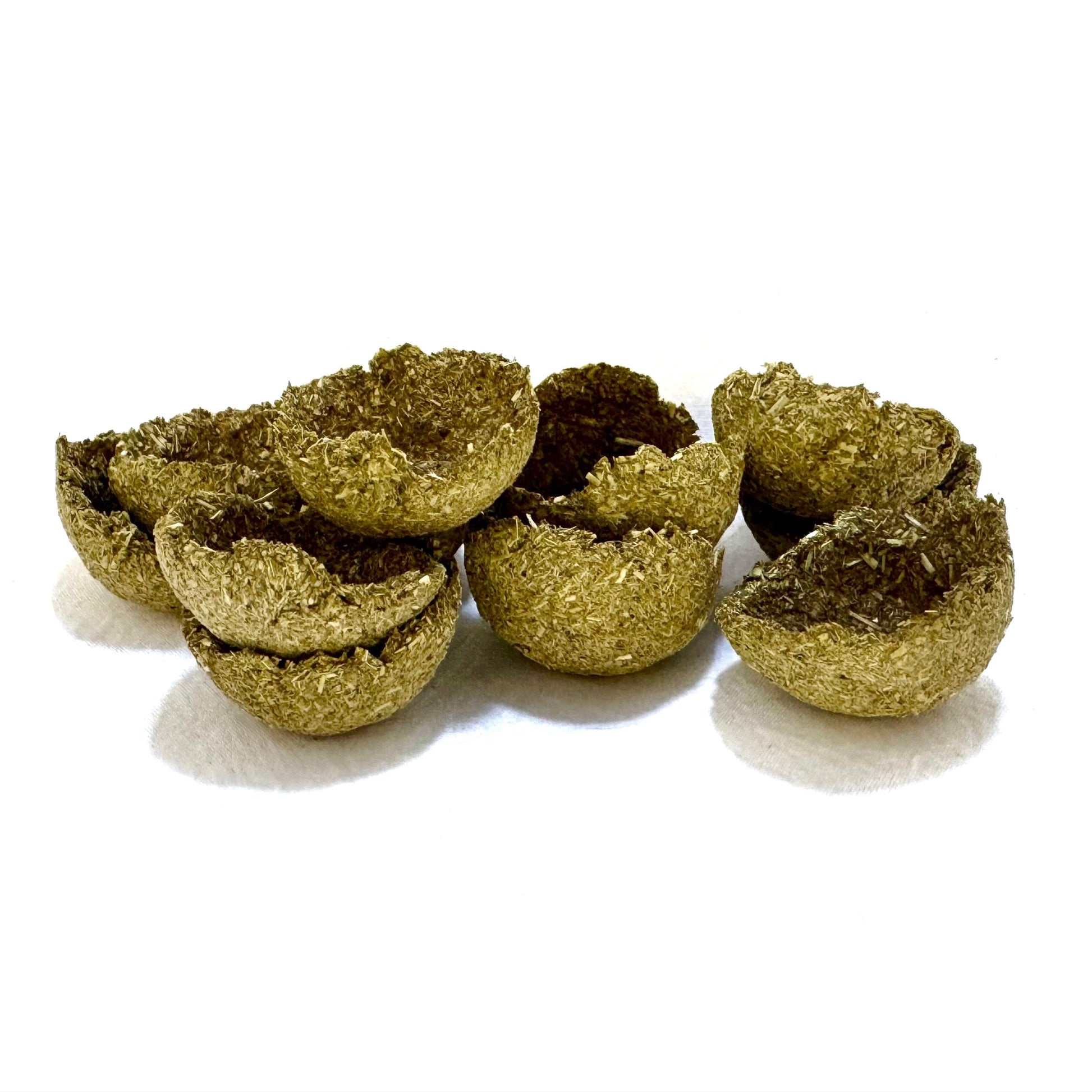 Our Papaya Wellness Bowls are handmade with timothy hay and a hint of organic papaya, shaped into small cups just the right size for holding liquid medications or supplements. Designed for rabbits who turn their noses up at syringes or suspicious treats, these bowls are made to make med time a little easier on everyone. Bowls will absorb thin, water-like medications and contain thicker, syrupy formulas without spilling. They are sized to accommodate most standard doses of rabbit medications.